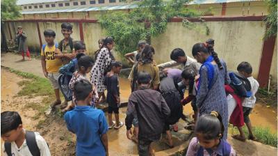 तेज बारिश ने सरकारी स्कूल को बनाया तालाब, बच्चों को गोद में उठाकर बाहर ले गए अभिभावक