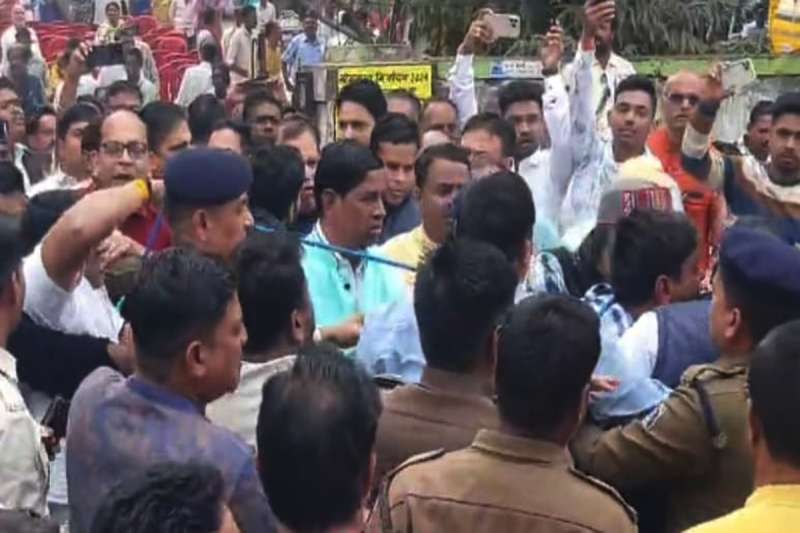 दोनों पक्षों के बीच विवाद इतना बढ़ गया कि हाथापाई और लात-घूंसे तक चलने की नौबत आ गई। वहां मौजूद पुलिस कर्मियों ने बीच-बचाव कर दोनों पक्षों के बीच मामला शांत कराया, लेकिन बीच-बचाव करने में पुलिस कर्मियों को भी पसीना बहाना पड़ा। यहां भगदड़ जैसी स्थिति बन गई। खबर लिखे जाने तक बवाल जारी था और कार्यक्रम शुरू नहीं हुआ था।