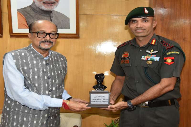 रायपुर: राज्यपाल श्री रमेन डेका से आज यहां राजभवन में 155 इन्फैंट्री बटालियन जम्मू-कश्मीर राइफल्स (छत्तीसगढ़ टेरियर्स) नवा रायपुर के कमाडिंग ऑफिसर कर्नल राज कुमार ने सौजन्य भेंट की।