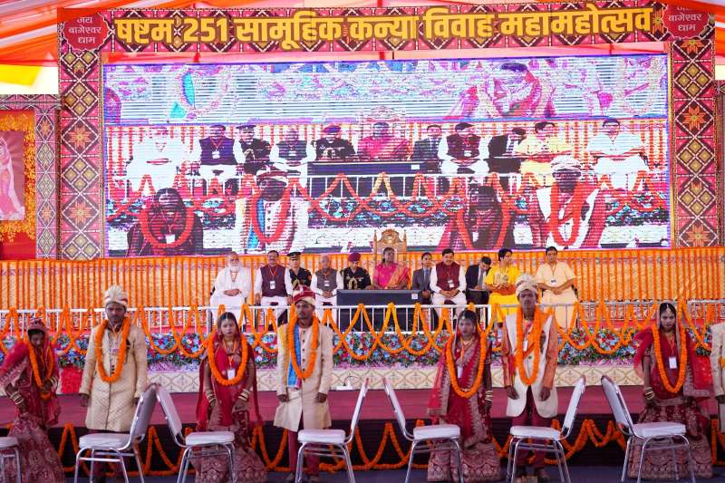 छतरपुर: भारत की राष्ट्रपति द्रौपदी मुर्मू बुधवार को मध्य प्रदेश के छतरपुर जिले में स्थित बागेश्वर धाम में आयोजित सामूहिक विवाह महोत्सव में शामिल हुईं। यहां उन्होंने नवविवाहित जोड़ों को आशीर्वाद दिया और उनके उज्ज्वल भविष्य की कामना की। इस दौरान उन्होंने वर-वधू को उपहार स्वरूप सूट और साड़ी भेंट की। इसके बाद महामहिम ने अपने संबोधन में पंडित धीरेंद्र कृष्ण शास्त्री को ऐसे कल्याणकारी कार्य करने के लिए धन्यवाद दिया। साथ ही महामहिम ने कहा- 'संतों ने हमेशा समाज को सही राह दिखाई है।' महाशिवरात्रि पर बागेश्वर धाम में सामूहिक विवाह महोत्सव का आयोजन किया गया. कार्यक्रम के आयोजक पंडित धीरेंद्र कृष्ण शास्त्री हैं. इसमें देश की राष्ट्रपति द्रौपदी मुर्मू भी शामिल हुईं। जहां उन्होंने 251 जोड़ों को आशीर्वाद दिया, साथ ही उनके उज्ज्वल भविष्य की कामना की। साथ ही उन्होंने वर-वधू को सूट और साड़ी भेंट की।